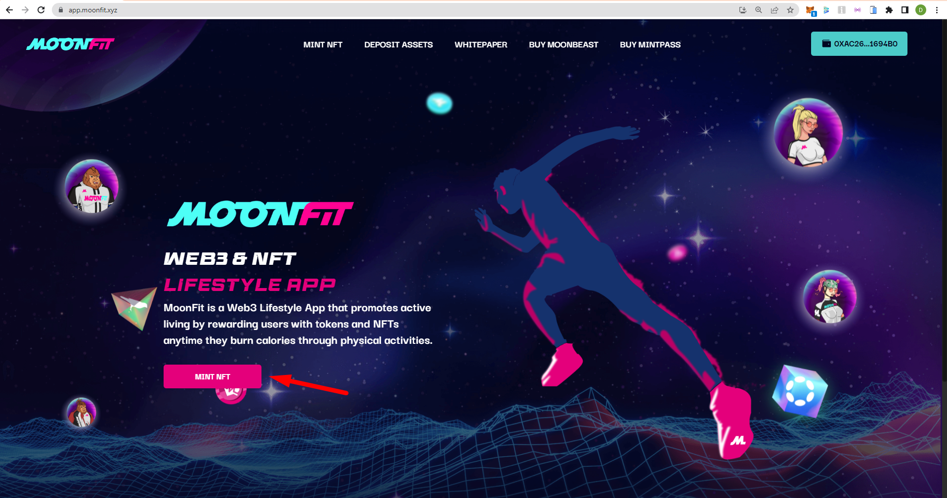 In addition to in-app NFT minting, we also support web NFT minting. Please visit <https://app.moonfit.xyz/> and connect to your wallet address. Click the " MINT NFT" button to navigate to the NFT minting page.